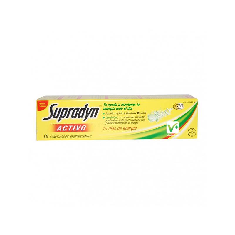 Supradyn Activo es una nueva generación de polivitamínicos con minerales que, complementando tu dieta habitual ayuda a mantener tu energia y vitalidad todo el dia. La base de Suprdyn Activo es una fórmula completa y hecha a medida de micronutrientes vitales:vitaminas,minerales y oligoelementos. Respeta los procesos naturales del organismo :los micronutrientes de Supradyn Activo estan equilibrados en dosis y proporciones más adecuados,de acuerdo con las tablas de cantidades diarias recomendadas,por la Union Europea. Recuerda, ante cualquier duda sobre SUPRADYN ACTIVO EFERVESCENTE 15 COMPRIMIDOS de la familia SUPLEMENTOS VITAMÍNICOS de vfarma la parafarmacia de venta online de Farmacia Poniente 24h, tenemos un equipo de profesionales para resolver cualquier duda las 24 horas del día en nuestras vias de comunicación: Teléfono, whatsapp, email o la propia farmacia.